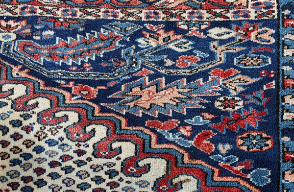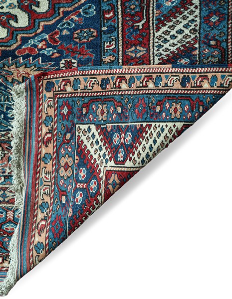 Tappeto Kars, Est Anatolia, secolo XX. Decoro con medaglione esagonale su fondo bianco, angolari a fondo blu con motivi floreali stilizzati. Molteplici bordure, la principale a meandro (cm 265x210) (difetti)
