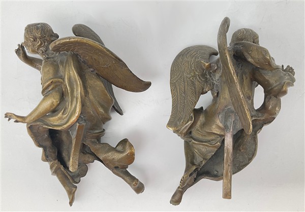 Coppia di elementi decorativi in fusione di bronzo raffiguranti angeli. Secolo