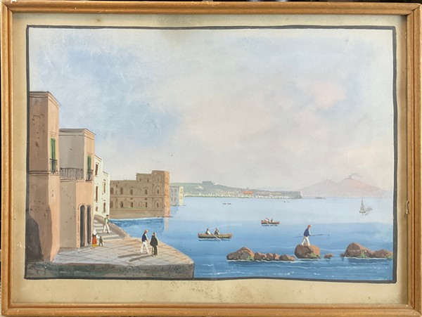 Lotto di tre gouache su carta raffiguranti vedute costiere napoletane di cui una col Vesuvio (cm 20x29), in cornici (lievi difetti)