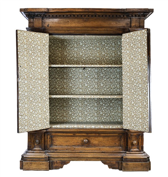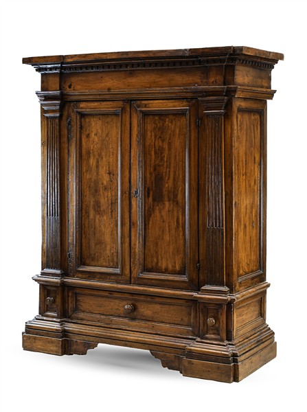 Armadio in noce con fronte a due ante pannellate fra lesene scanalate, base con cassetto centrale e due cassetti più piccoli sotto le lesene. Piedi a mensola e cappello con modanatura a dentelli (cm 144x180x60) (difetti)