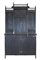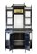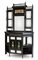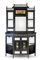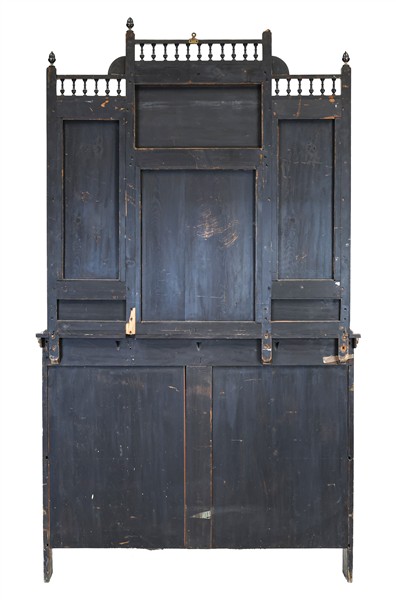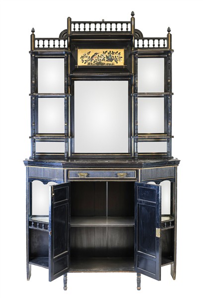 Servante scantonata in legno ebanizzato con profili dorati, parte inferiore ad un cassetto, due ante con inserti a specchio e pannellature dipinte tra ripiani; parte superiore con mensole e colonnine tornite su fondo con specchi molati e cimasa a balaustra. Inizio secolo XX (cm 128x220x40) (difetti e mancanze)