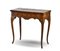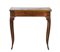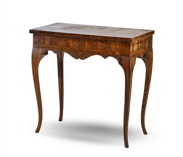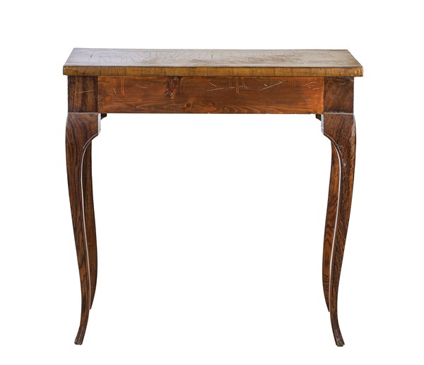 Tavolino da parete lastronato in legni di differenti essenze, gambe mosse con p