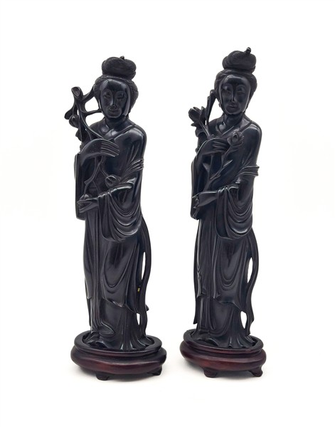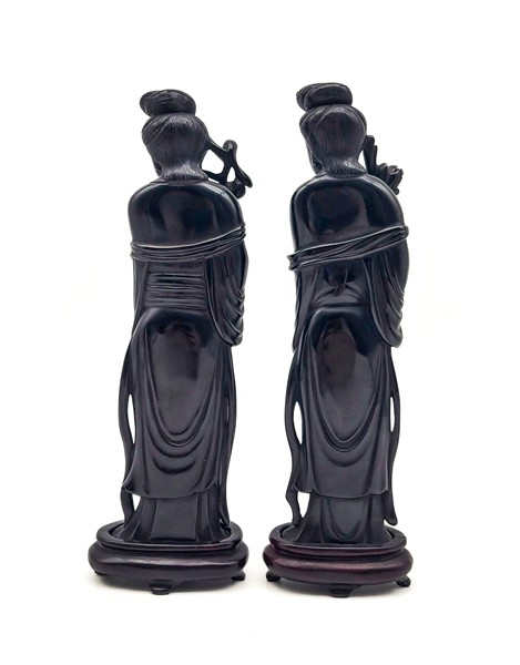 Coppia di dame dalle lunghe vesti in bachelite scura. Raffigurate con capelli a chignon e ramo fiorito tra le mani.