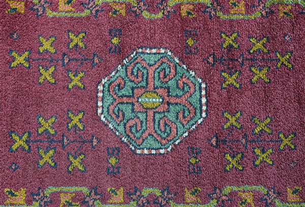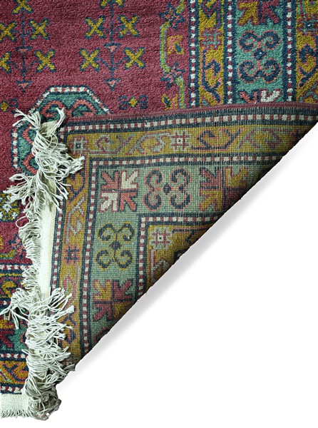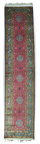 Tappeto orientale passatoia di recente manifattura. Decoro con sei medaglioni ottagonali a fondo verde su campo bordeaux (cm 358x80) (difetti)