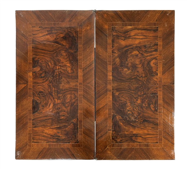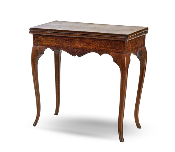 Lot 1112 | Tavolino da gioco con piano a libro in mogano ed altre essenze, gambe mosse con