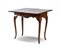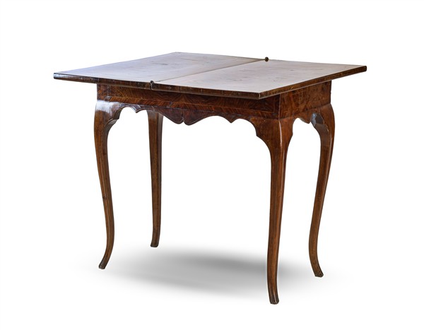 Tavolino da gioco con piano a libro in mogano ed altre essenze, gambe mosse con