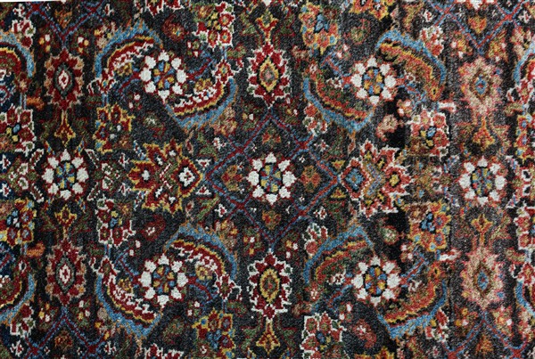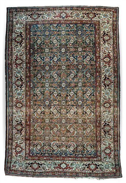 Tappeto Malayer, Persia, secolo XX. Decoro Herati policromo su fondo blu con abrash color nocciola. Bordura Herati su fondo bianco (cm 193x130) (difetti)