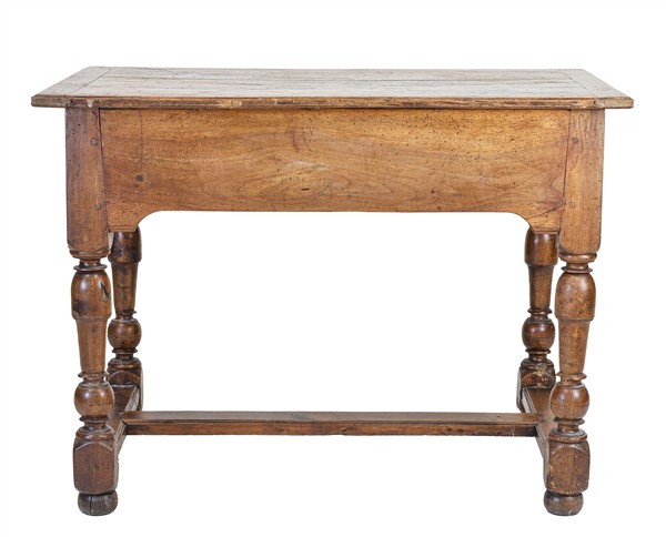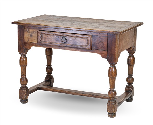 Scrittoio in noce con gambe tornite a rocchetto riunite da traversa, un cassetto nella fascia. Secolo XVIII (cm 105x77x64) (difetti e restauri)