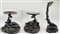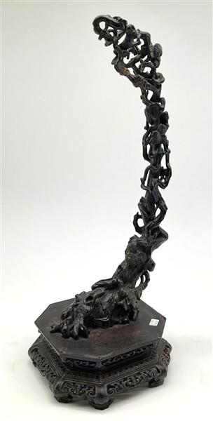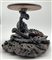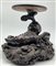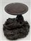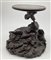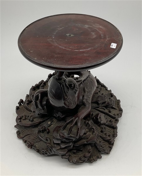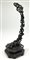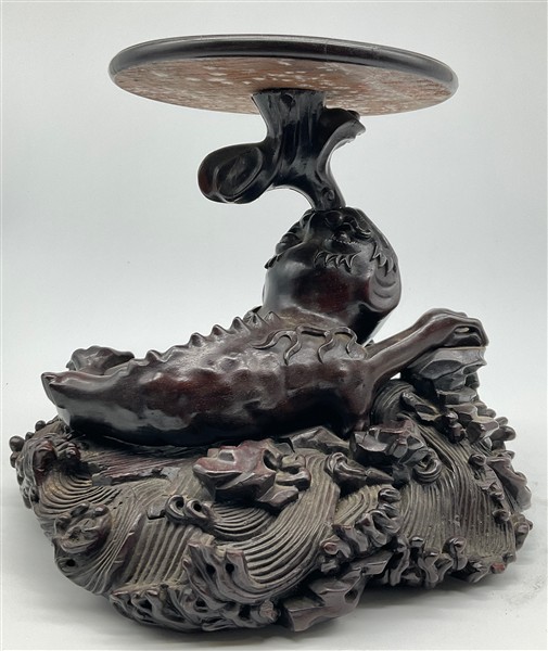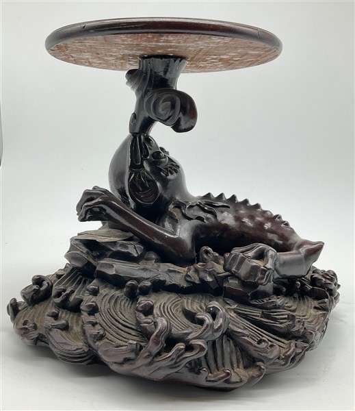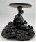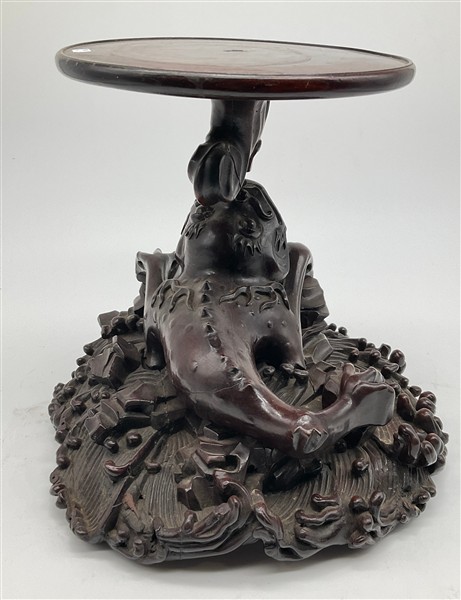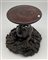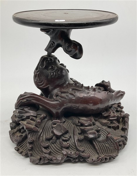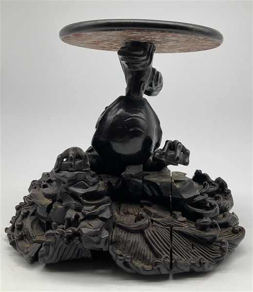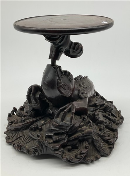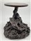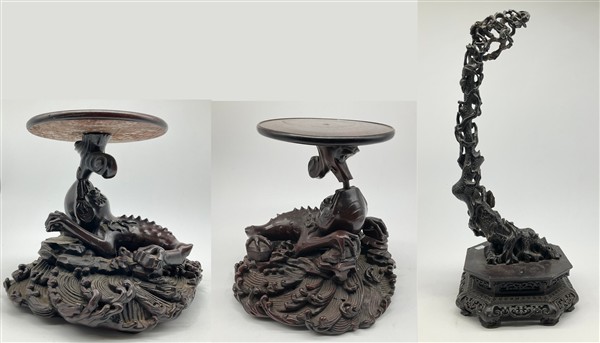 Coppia di basi in legno intagliato con sostegno ad animale fantastico e base a finte onde e piano circolare (h cm 29, d cm 29), unite a un sostegno in legno intagliato e tinto a ramo (h cm 43). Giappone, secolo XIX (difetti e rotture)