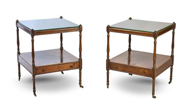 Coppia di tavolini in mogano di forma quadrata con sostegni torniti a due ripiani e un cassetto, piedi su rotelle. Inghilterra (cm 46x58x46) dotati di piano di protezione in vetro (difetti)