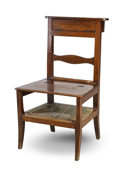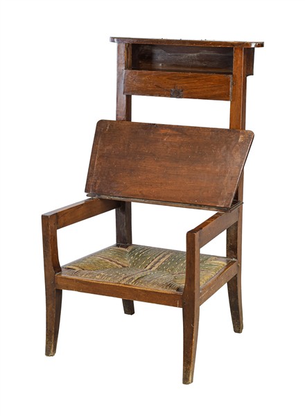 Sedia/Inginocchiatoio in noce con schienale a giorno e sportellino ribaltabile, seduta in parte ribaltabile con pianetto di raccordo in paglia. Secolo XIX (h cm 89) (difetti)