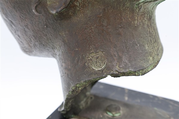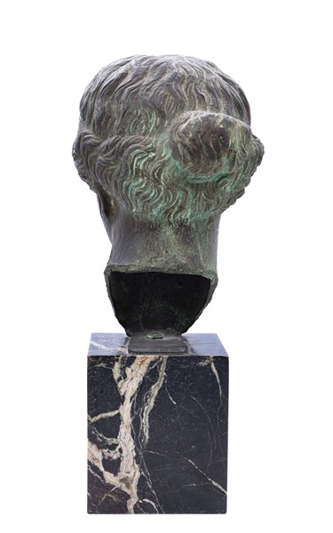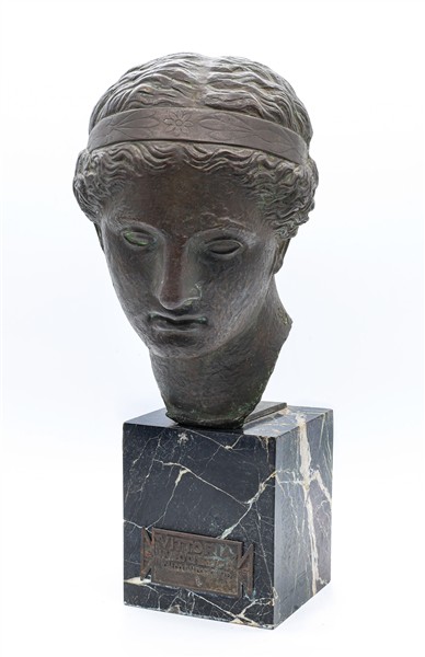 Fonditore di inizio secolo XX. Testa dalla Vittoria alata di Brescia in bronzo patinato su base a plinto in marmo, targhetta con iscrizione "Vittoria, Museo di Brescia, calco dall'originale". Timbri impressi del fonditore e numerali (h tot cm 49) (difetti)