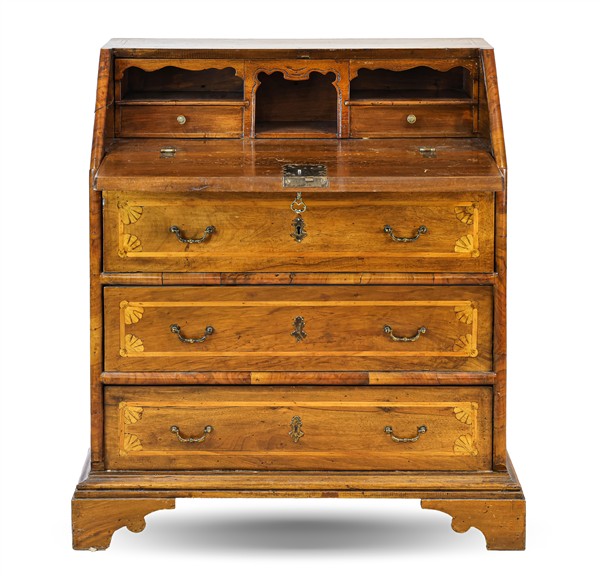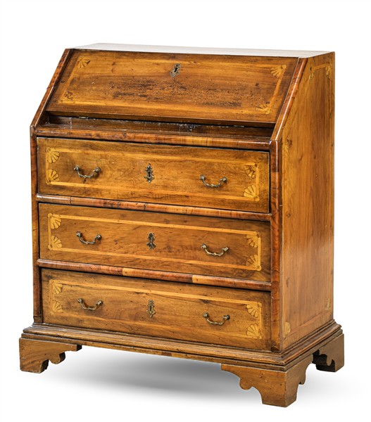 Lot 1146 | Ribaltina in legni vari a tre cassetti con calatoia celante due tiretti e vani