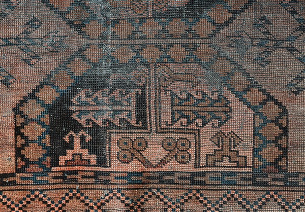 Tappeto Afghan, Turkestan occidentale, inizio secolo XX. Decoro con tre Gül a zampa di elefante nei toni del rosso bruciato (cm 210x110) (difetti e rapature)