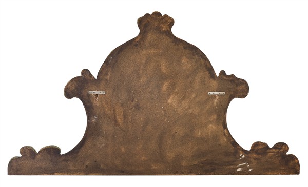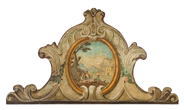 Fregio da sovrapporta in legno sagomato e dipinto in policromia a volute e medaglione con paesaggio e figure (cm 178x100) (difetti)