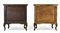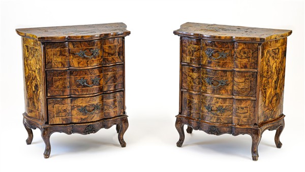 Lot 1197 | Coppia di comodini con fronte mosso a tre cassetti lastronati in radica di noce