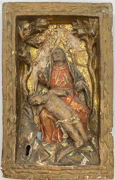 Sportello da tabernacolo in legno intagliato, dorato e dipinto in policromia raffigurante la Pieta a bassorilievo. Secolo XIX (cm 36x22,5) (difetti e mancanze)