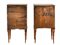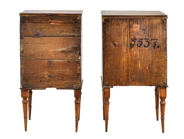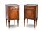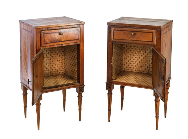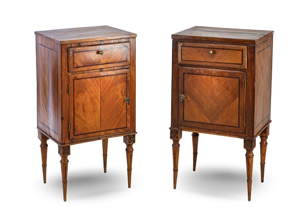 Due comodini lastronati e filettati in legni di varie essenze, fronte ad un'anta e un cassetto e gambe in parte scanalate. Veneto, fine secolo XVIII. (cm max 43x82x36) Stampigliature a fuoco e numerali al verso (difetti e restauri)