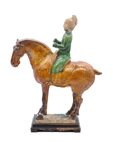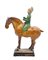 Figura di tamburino a cavallo in terracotta con invetriatura Sancai
