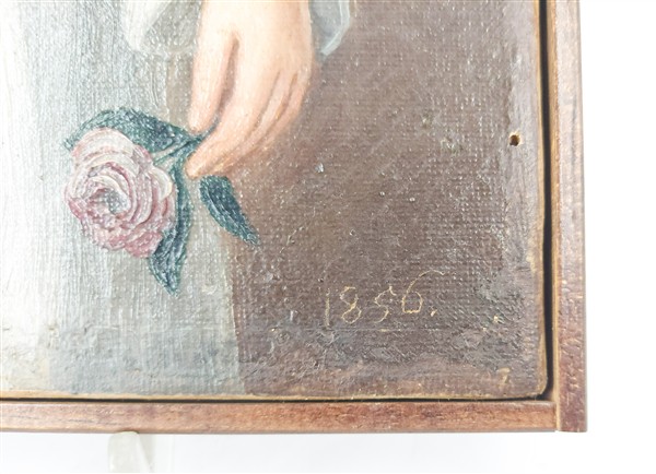 Ignoto del secolo XIX "Bimba con rosa" 1856 olio su tela (cm 35x24,5) datato i