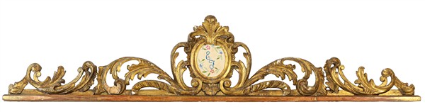 Fregio in legno intagliato e dorato a volute contrapposte con riserva ovale al centro. Secolo XIX (cm 162x6x35) (difetti e adattamenti)