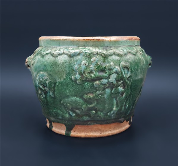 Vaso in ceramica smaltata verde con draghi a rilievo in stile Ming Cina, dinas