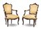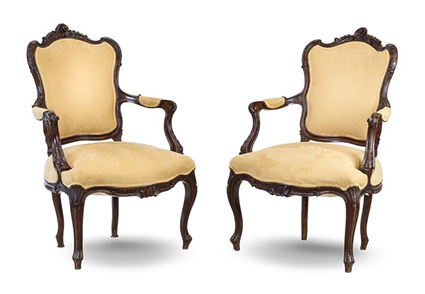 Coppia di poltrone di forma mossa in legno intagliato a foglie e volute, rivest