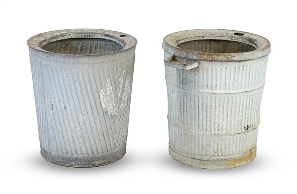 Lotto di due contenitori in zinco con fusti scanalati, di cui uno biansato e uno con iscrizione sul bordo "SOAP - NON SPLASH" (d cm 49, h cm 53) (difetti)