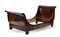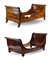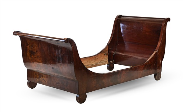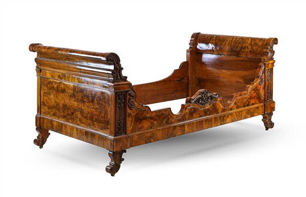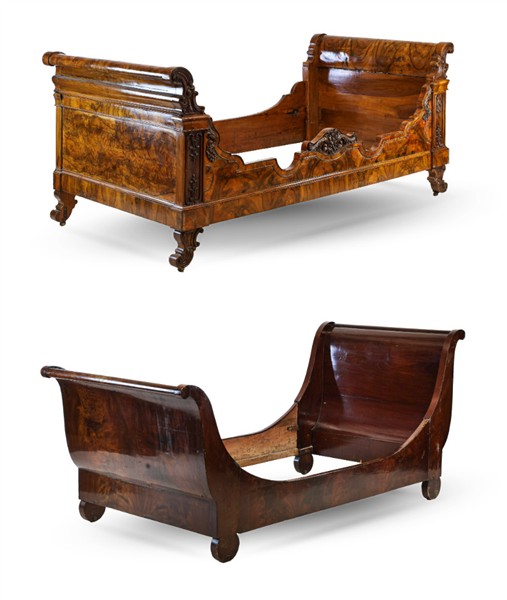 Lotto composto da due letti da parete, uno lastronato in radica di noce con fregi intagliati a volute (cm 112x230x99) e uno a barca impiallacciato in mogano (cm 107x228x106). Secolo XIX (difetti)