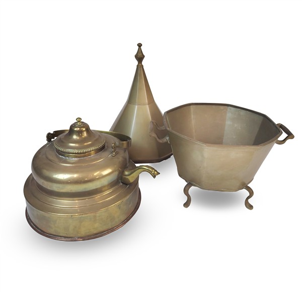 Lotto composto da una grande teiera in rame ottonato (cm 44x29) e un braciere marocchino biansato in metallo a sezione ottagonale (cm 47x70) (difetti)