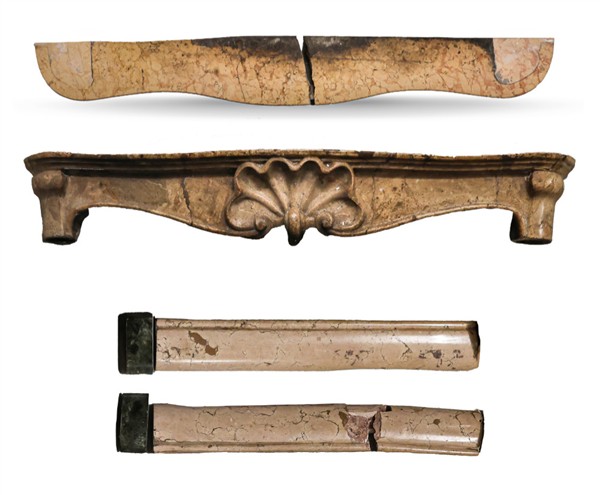 Camino in marmo rosa con fascia superiore mossa e scolpita a valva di conchiglia, montanti lisci (cm 152x115x20) (difetti, mancanze e restauri)