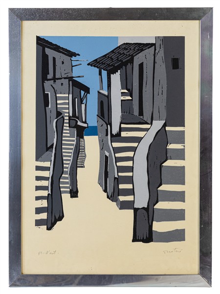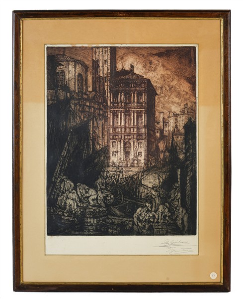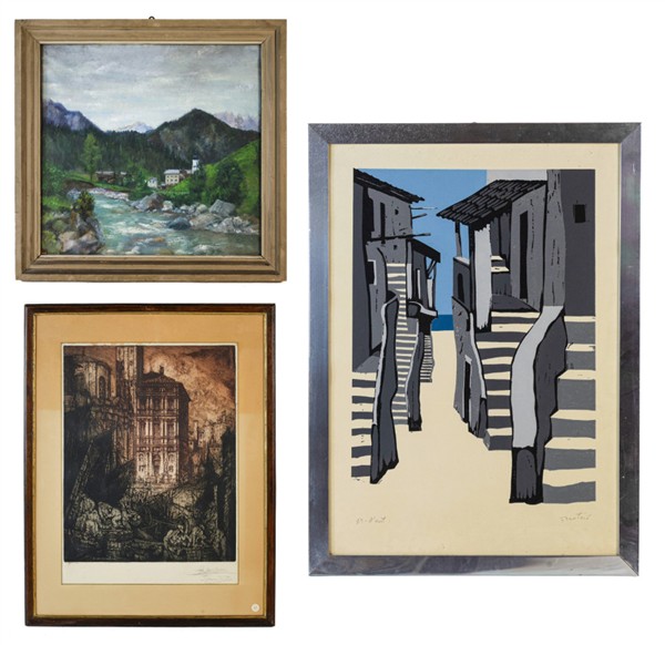 Lotto composto da un dipinto ad olio su tela non firmato, raffigurante paesaggio montano, una litografia a colori di di Enotrio e un acquaforte di autore indecifrato, datata 1924. Misure e soggetti diversi (misura max cm 64x66), due opere firmate, tutte in cornice