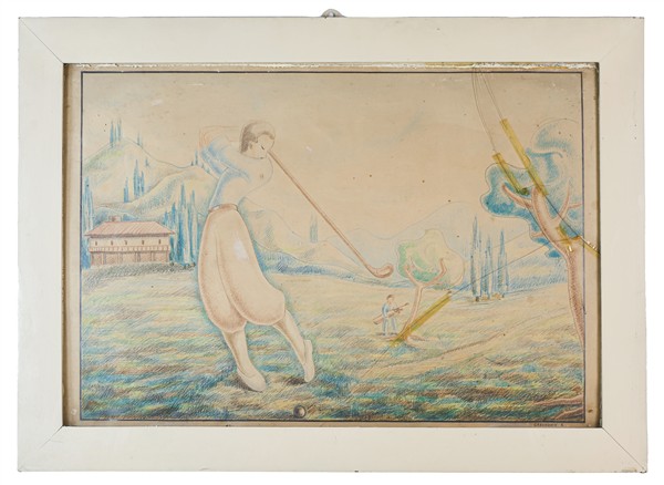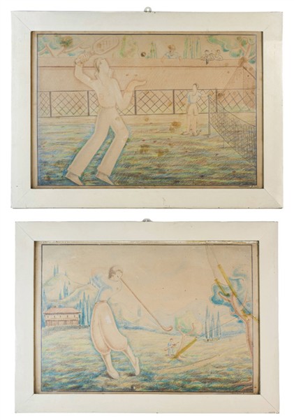 Gregnanis F. due tecniche miste su carta raffiguranti due giocatori di tennis e golf (cm 73x107,5) firmati in basso a destra a matita, in cornici