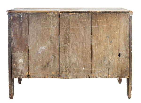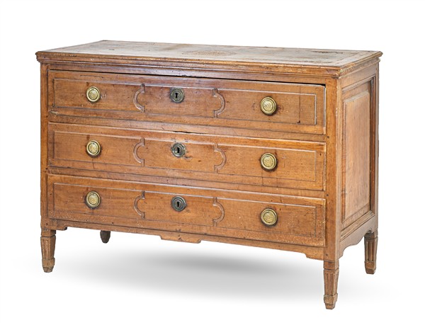 Cassettone in noce con fronte a tre cassetti decorato da scanalature mistilinee, gambe rastremate e scanalate. Fine secolo XVIII (cm 127x91x56) (difetti e restauri)