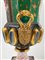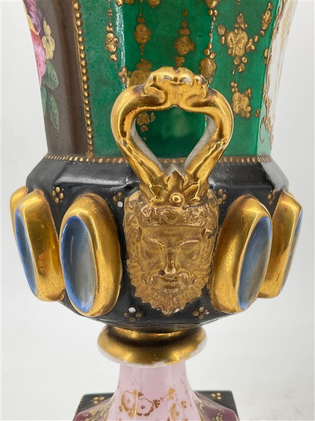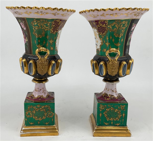 Manifattura del secolo XIX, coppia di vasi biansati in porcellana dipinta in policromia a motivi naturalistici con basi a plinto, decori in oro a rilievo ed anse a mascheroni (h cm 34) (difetti e restauri)