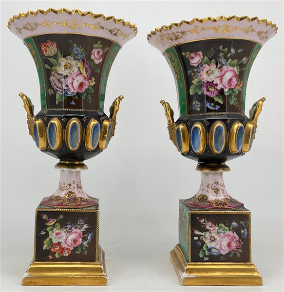 Manifattura del secolo XIX, coppia di vasi biansati in porcellana dipinta in po