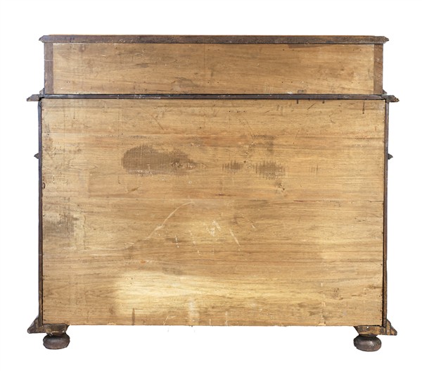 Credenza piemontese in noce con pannellature bugnate, fronte a due sportelli e tre cassetti allineati sottopiano, parte superiore a quattro cassetti (cm 160x138x53) (difetti)