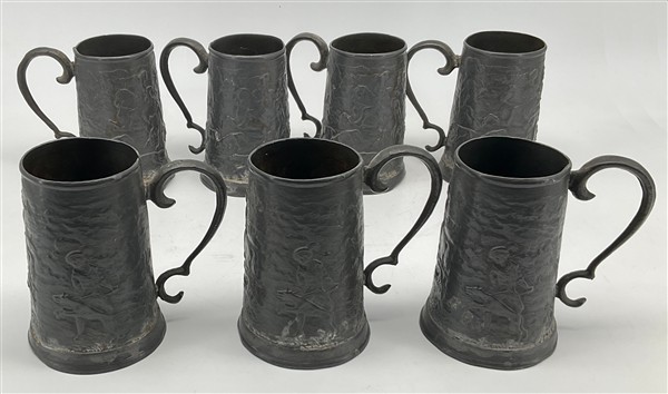 Lotto composto da sette boccali in fusione di peltro con decori a rilievo a sce