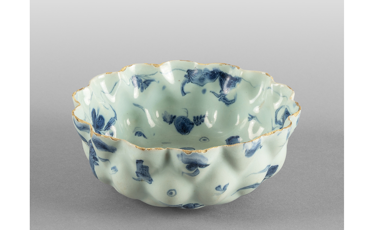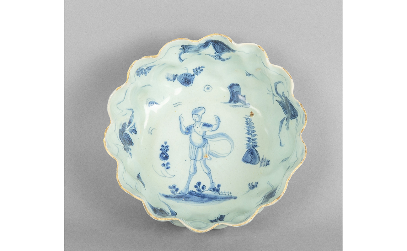 Coppetta in ceramica bugnata a decorazione bianca e blu su fondo berrettino con figura centrale marca Stemma con le lettere B e C Savona sec.XVII/XVIII