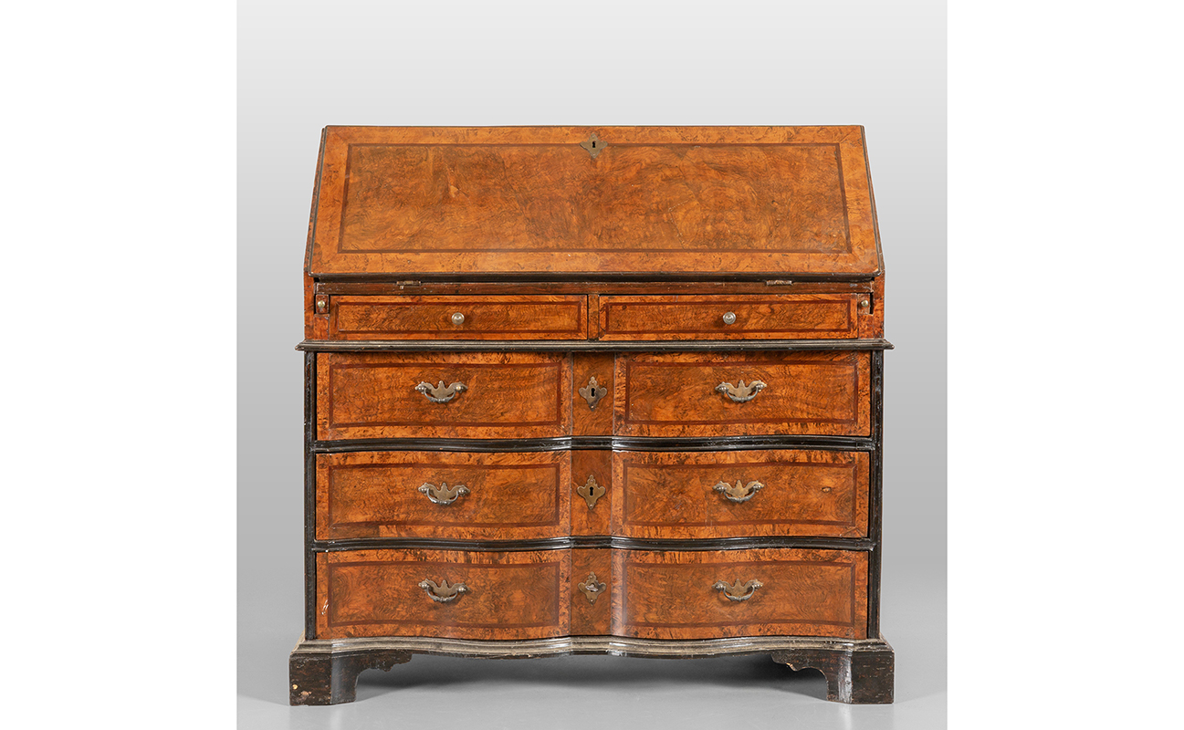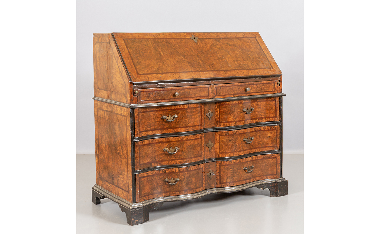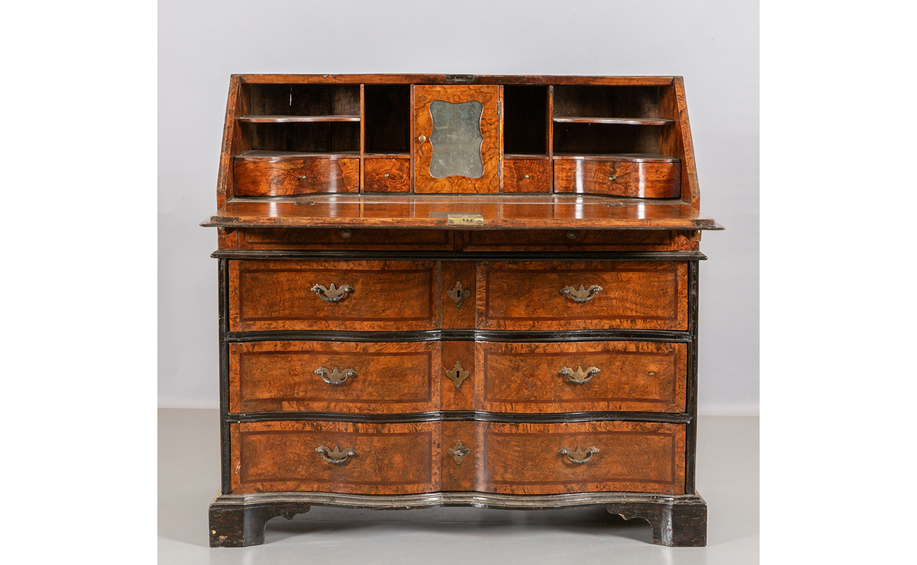 Ribalta Luigi XIV a tre cassetti più due lastronata in radica Genova sec.XVIII
