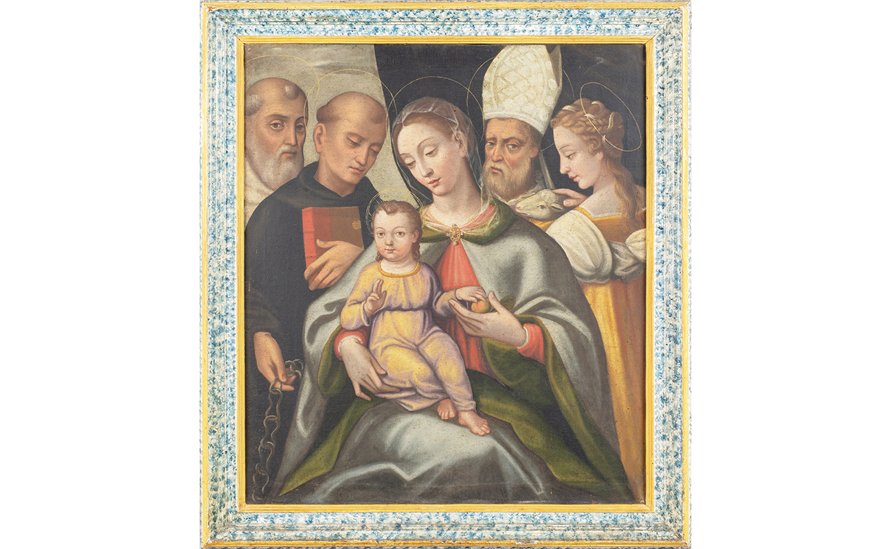 Scuola senese sec.XVI 'Madonna con Bambino Sant'Anna e i dottori della Chiesa' olio cornice coeva in legno intagliato e laccato a finto marmo