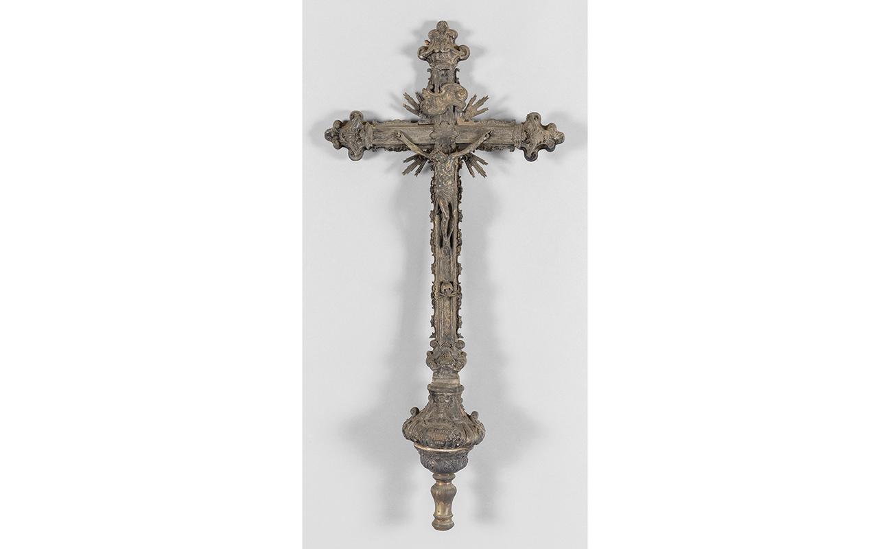 Grande Crocefisso Luigi XV in argento finemente sbalzato e inciso opera probabile di Lorenzo Greco 1768 vedi incisione nella base nel retro simboli francescani