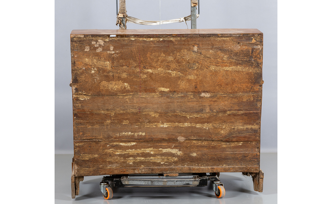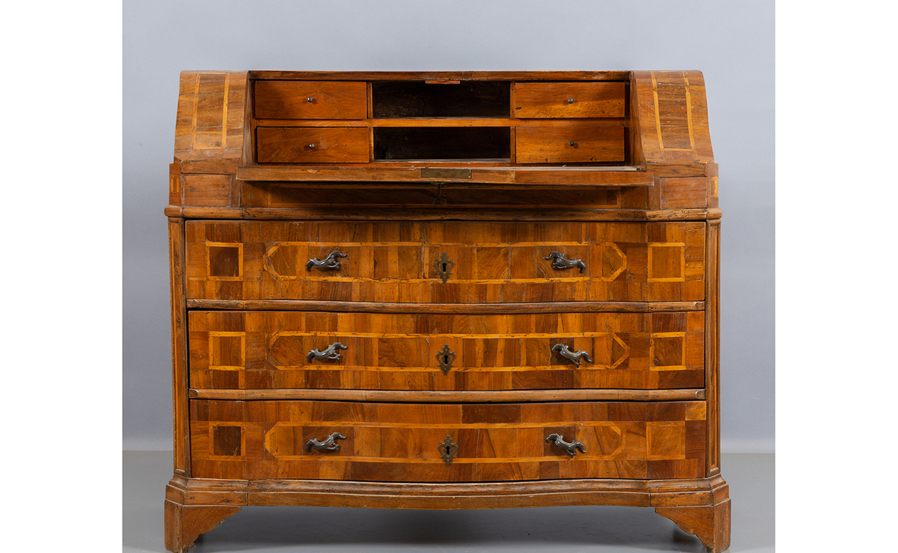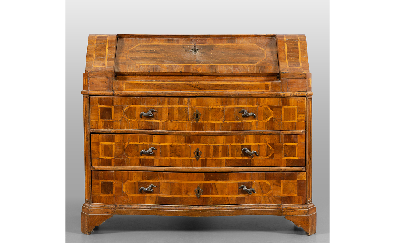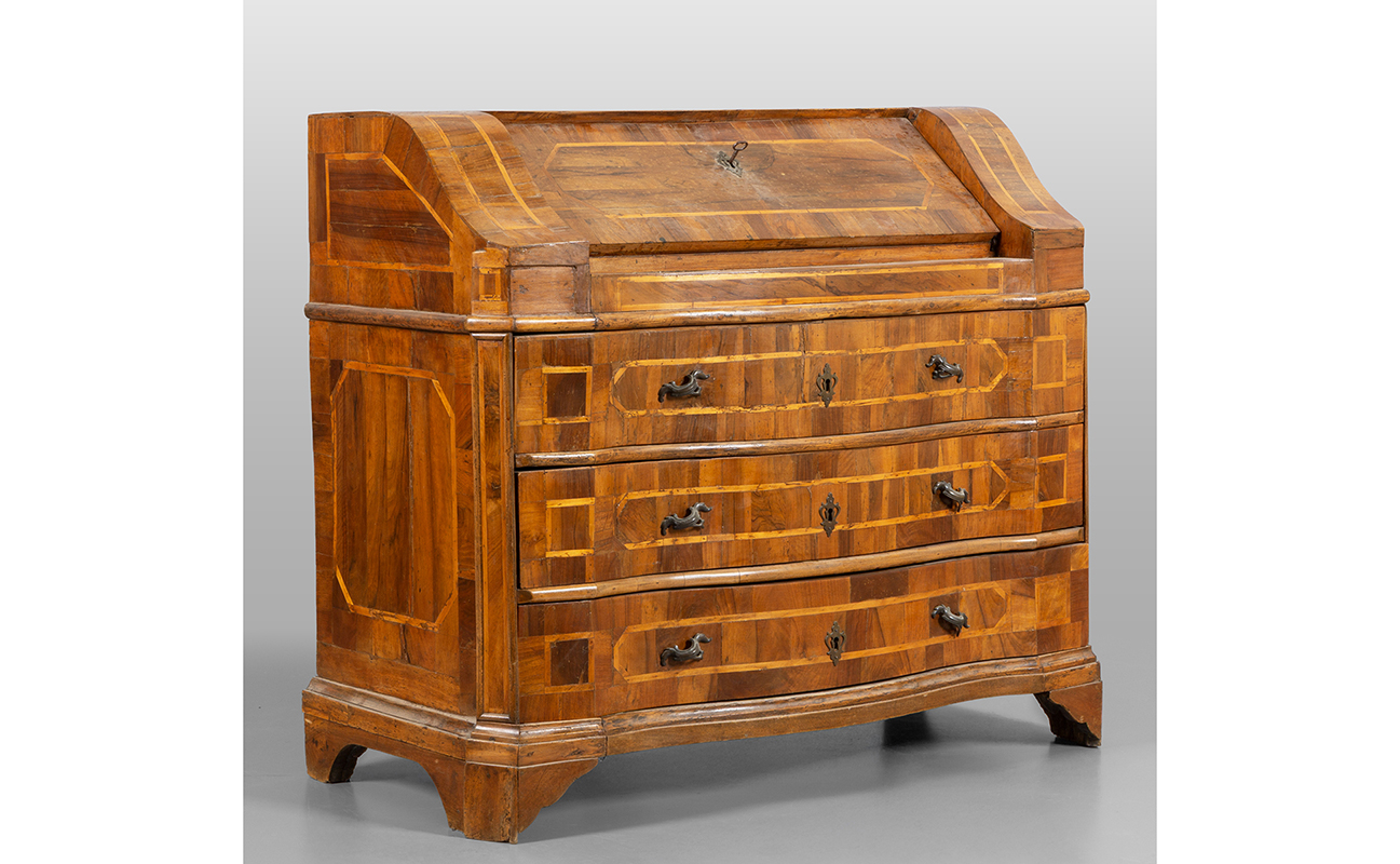 Mobile a ribalta Luigi XIV tre cassetti movimentato sul fronte lastronato in noce e filettato in legno chiaro Verona sec.XVIII