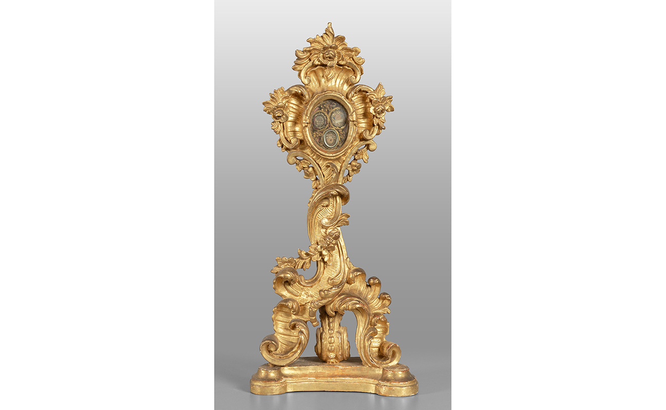 Reliquiario Luigi XV in legno finemente intagliato e dorato Piemonte I metà sec.XVIII
