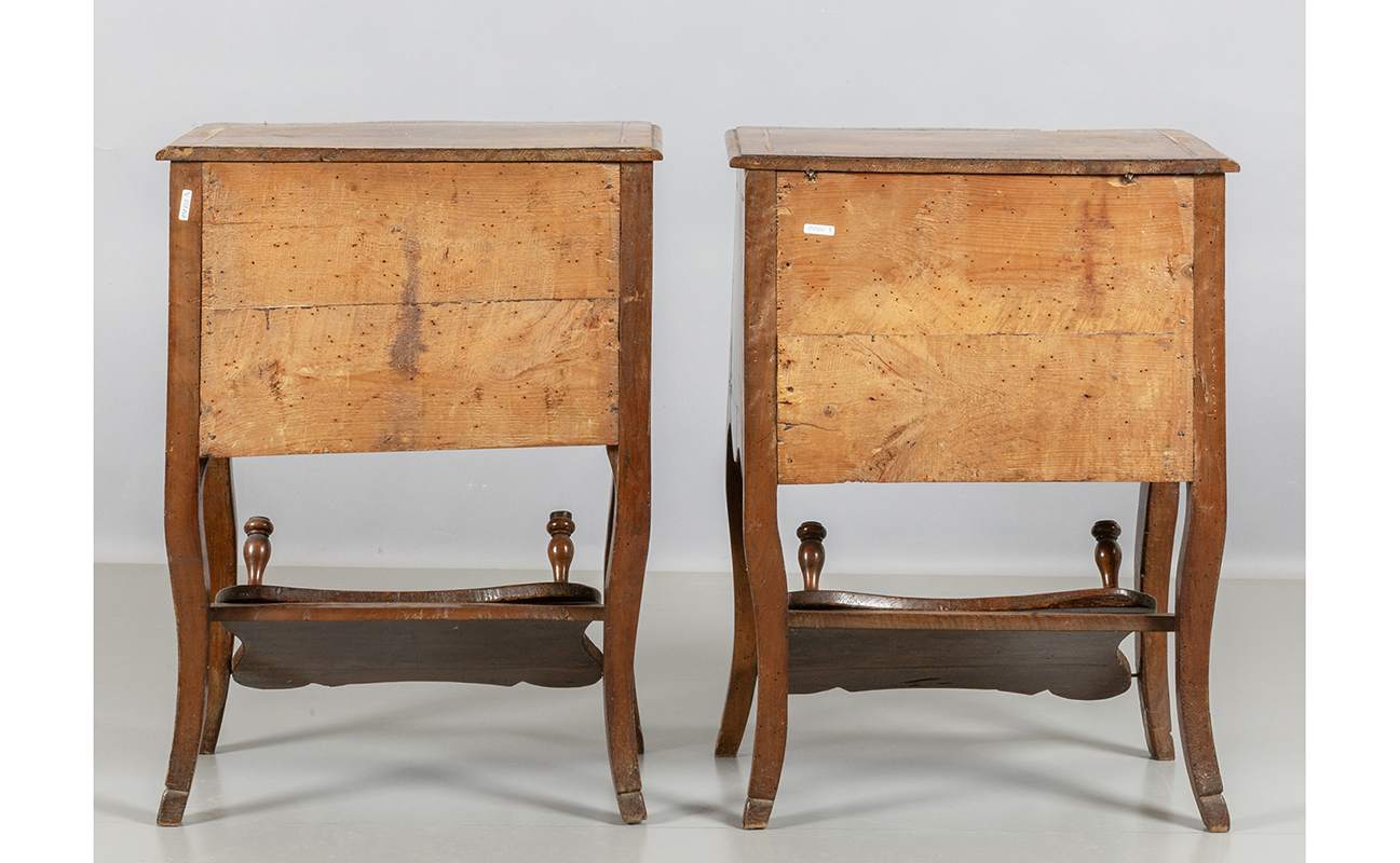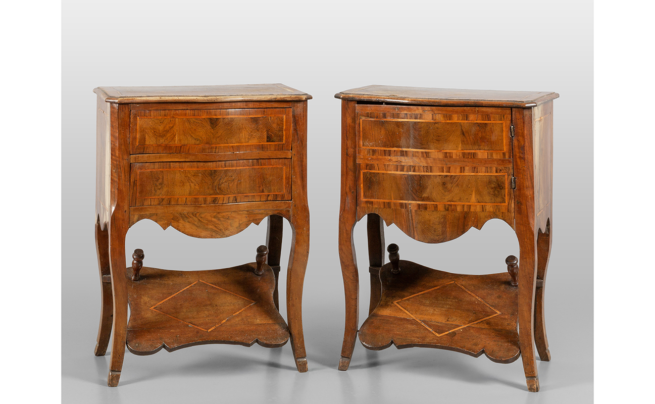 Coppia di comodini Luigi XIV lastronati uno con sportello e uno a due cassetti pianetto inferiore ribaltabile a inginocchiatoio Stato Pontifico sec.XVIII