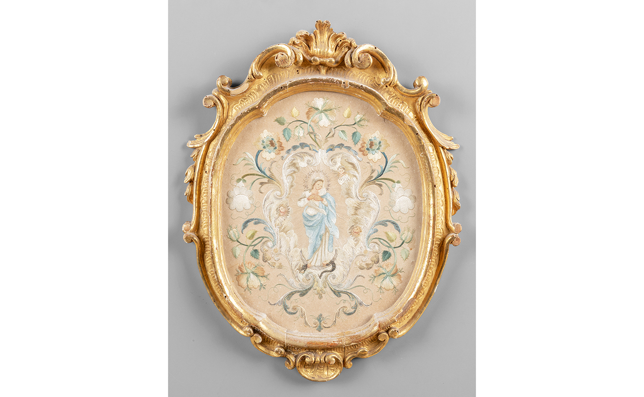 Ricamo raffigurante Madonna tra Angeli e fiori cornicetta in legno intagliato e dorato sec.XVIII