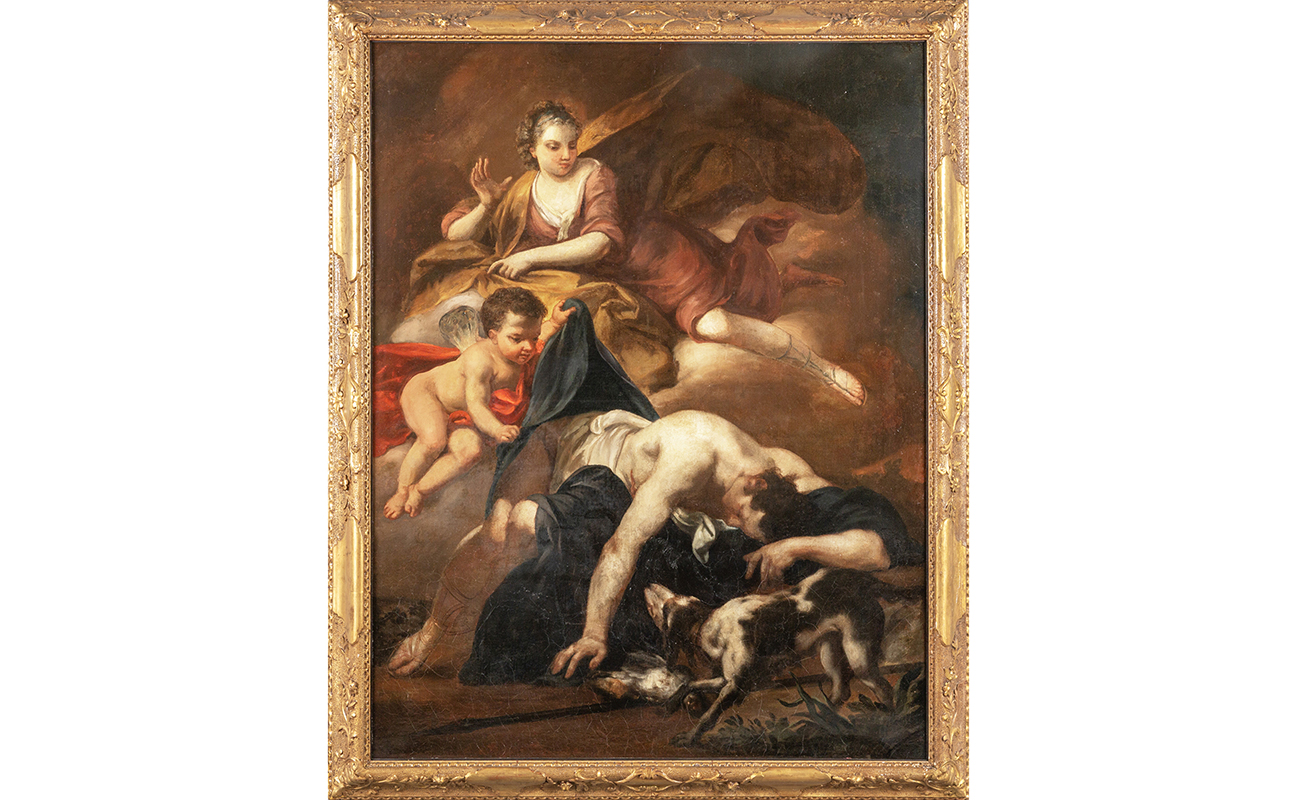 Scuola genovese sec.XVII (Domenico Fiasella) 'Venere a Adone' olio cornice in legno intagliato e dorato