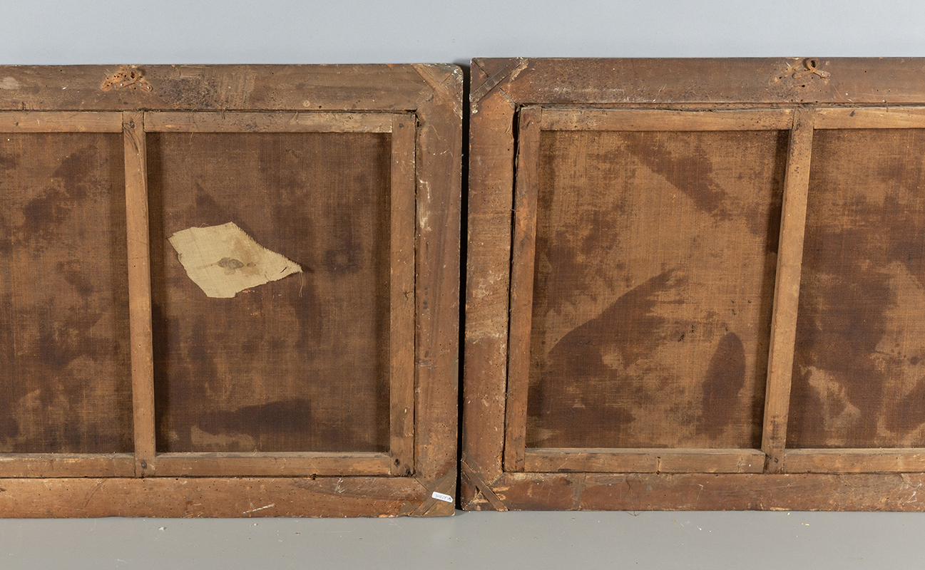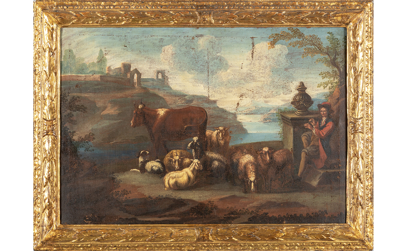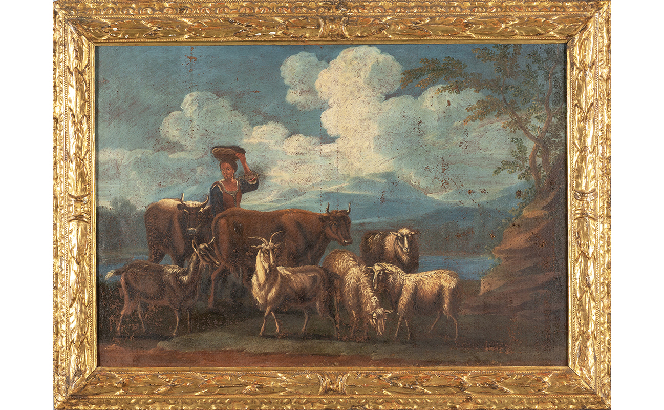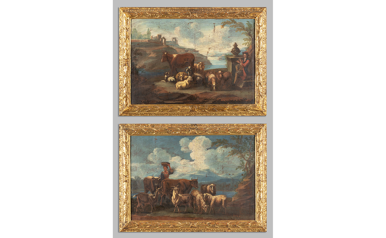 'Paesaggi con armenti' coppia di olii cornici coeve in legno intagliato e dorato