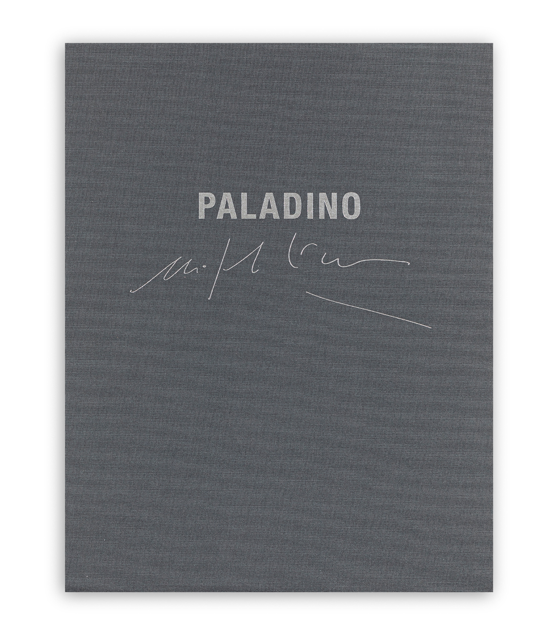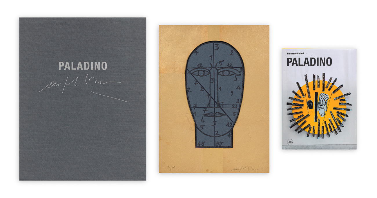 Entro cofanetto originale in cartone rigido foderato comprensivo di colophon di presentazione numerato e volume 'Paladino' a cura di Germano Celant (Skira Edizioni)