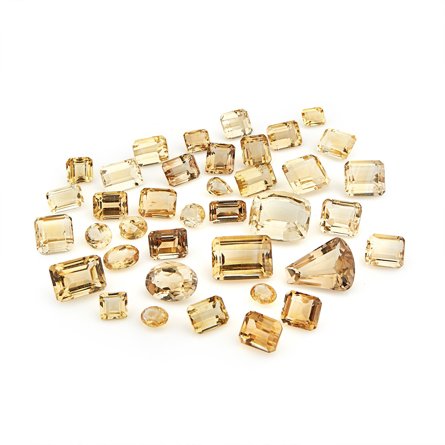 di varie forme, ovale, goccia, rettangolare (ottagonale), quadrato, trapezio e cuscino, taglio sfaccettato e a gradini, difetti (alcuni presentano rotture e mancanze).